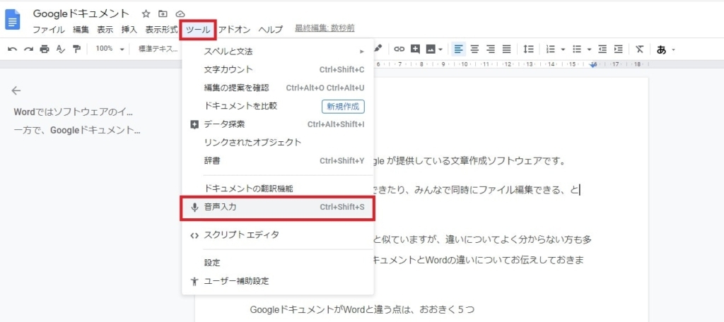 1.Google ドキュメントは、音声で文字入力もできる。